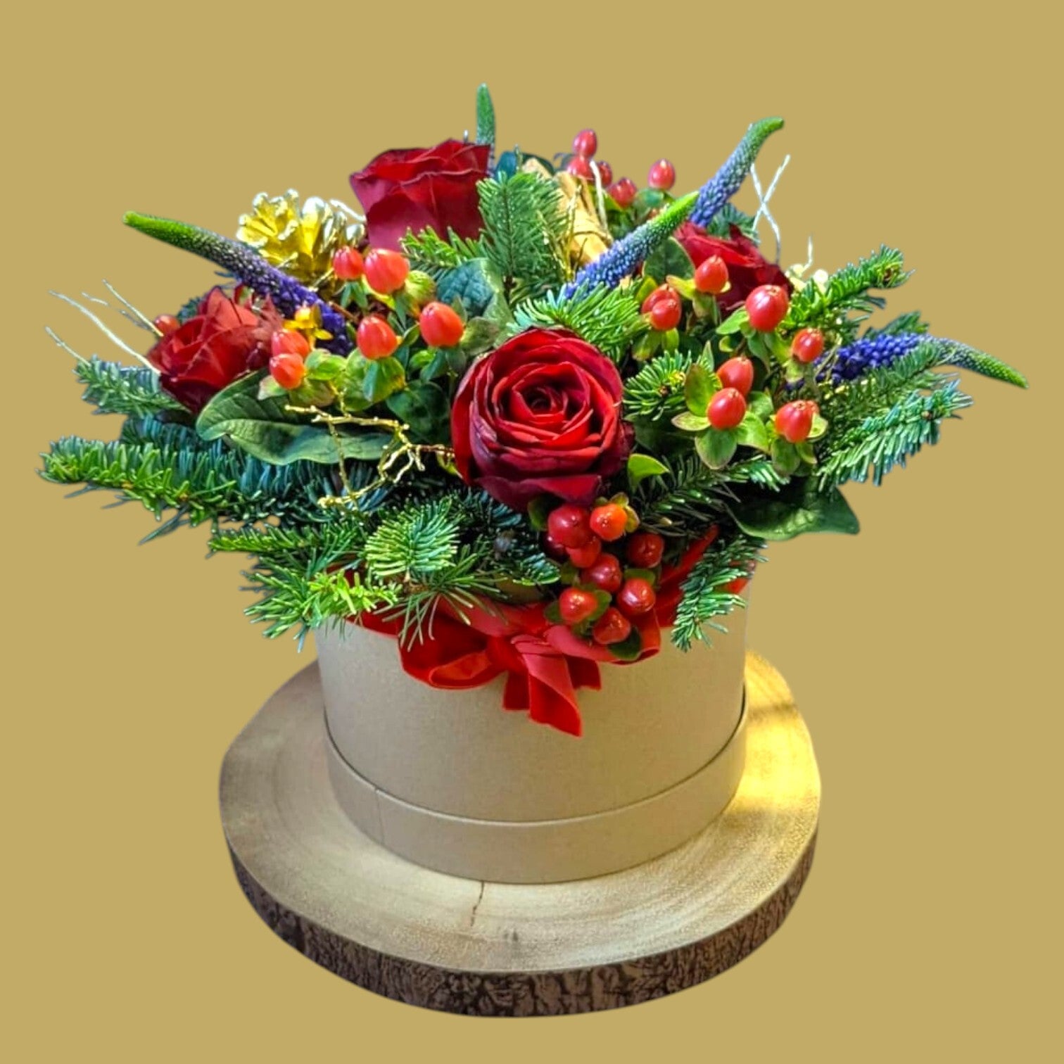 Bursting with rich seasonal blooms — think velvety red roses, winter berries, pinecones, and fresh evergreens — this handcrafted arrangement brings festive elegance to any space.