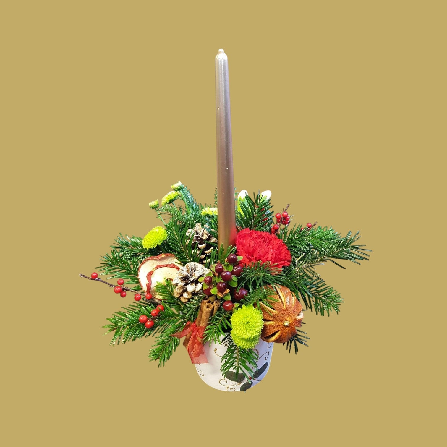 Add a touch of holiday charm to any space with this delightful Christmas floral arrangement. Designed in a festive pot with a pillar candle, it features a mix of seasonal blooms such as deep red roses, white chrysanthemums, winter berries, pine foliage, and festive accents — perfectly balanced to capture the warmth and sparkle of the season.