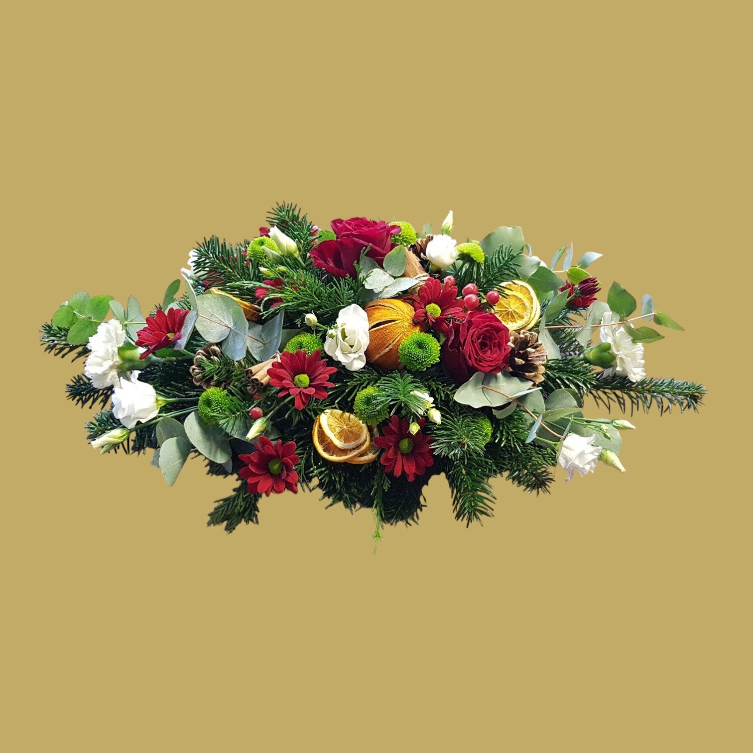 Remember your loved ones this holiday season with our beautifully handcrafted Festive Memorial Spray. Featuring seasonal evergreens, vibrant blooms, pinecones, and berries, this grave arrangement is a heartfelt tribute that combines dignity with the warmth of Christmas.